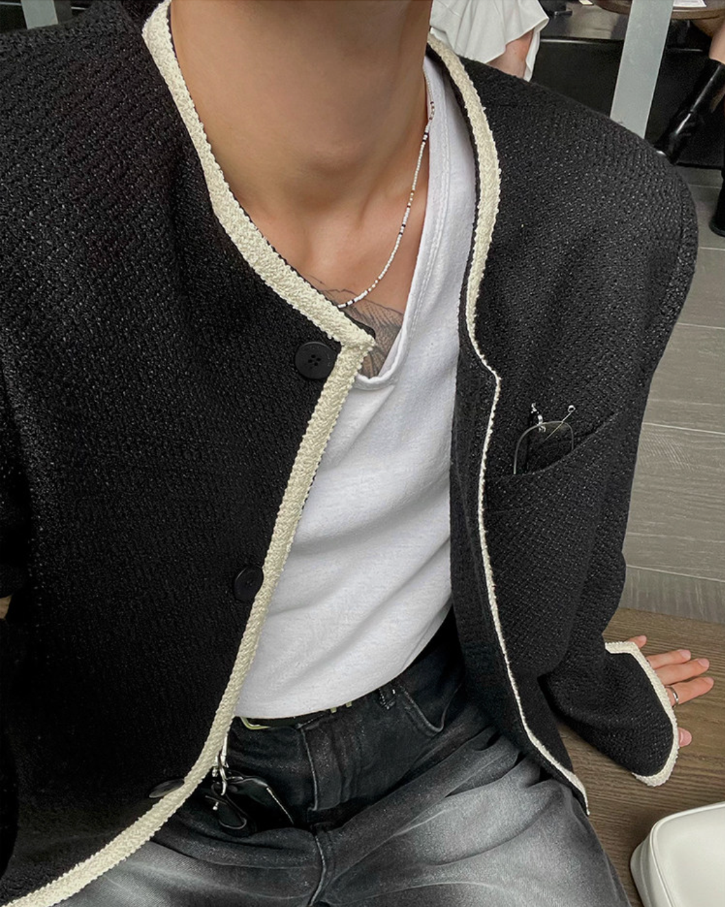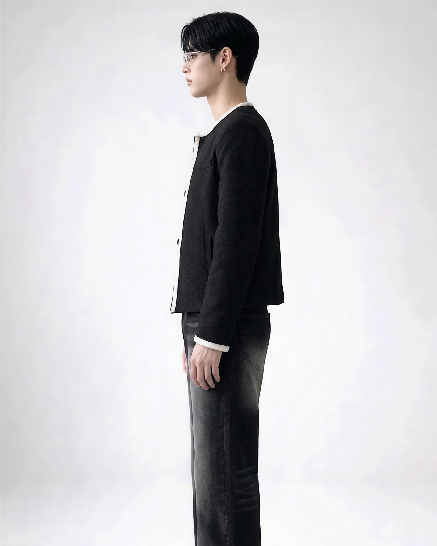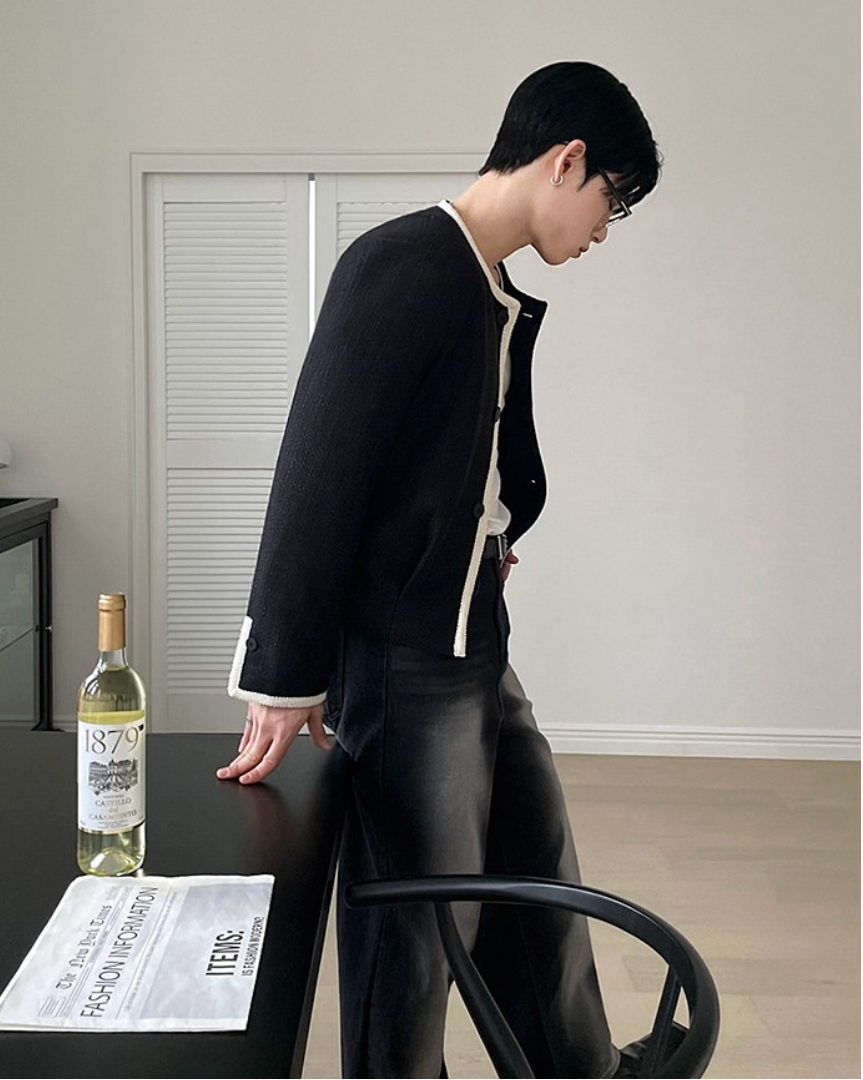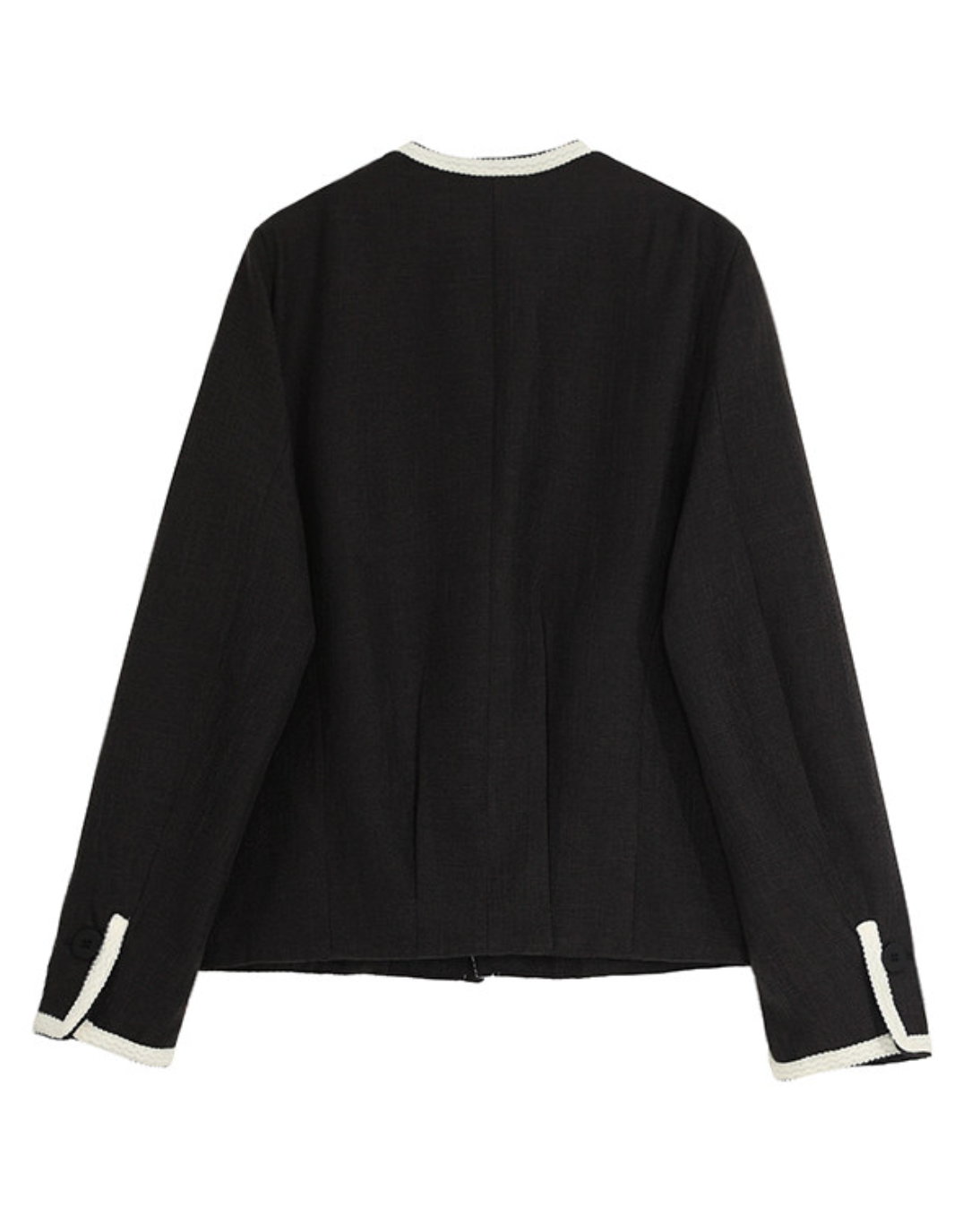 首元をすっきり見せるノーカラーに、