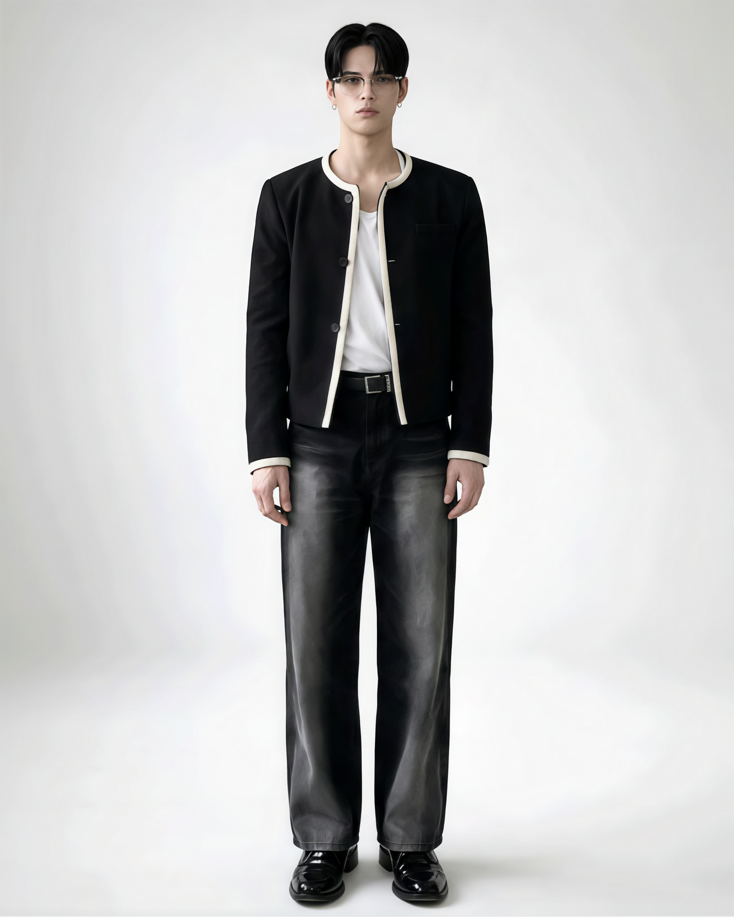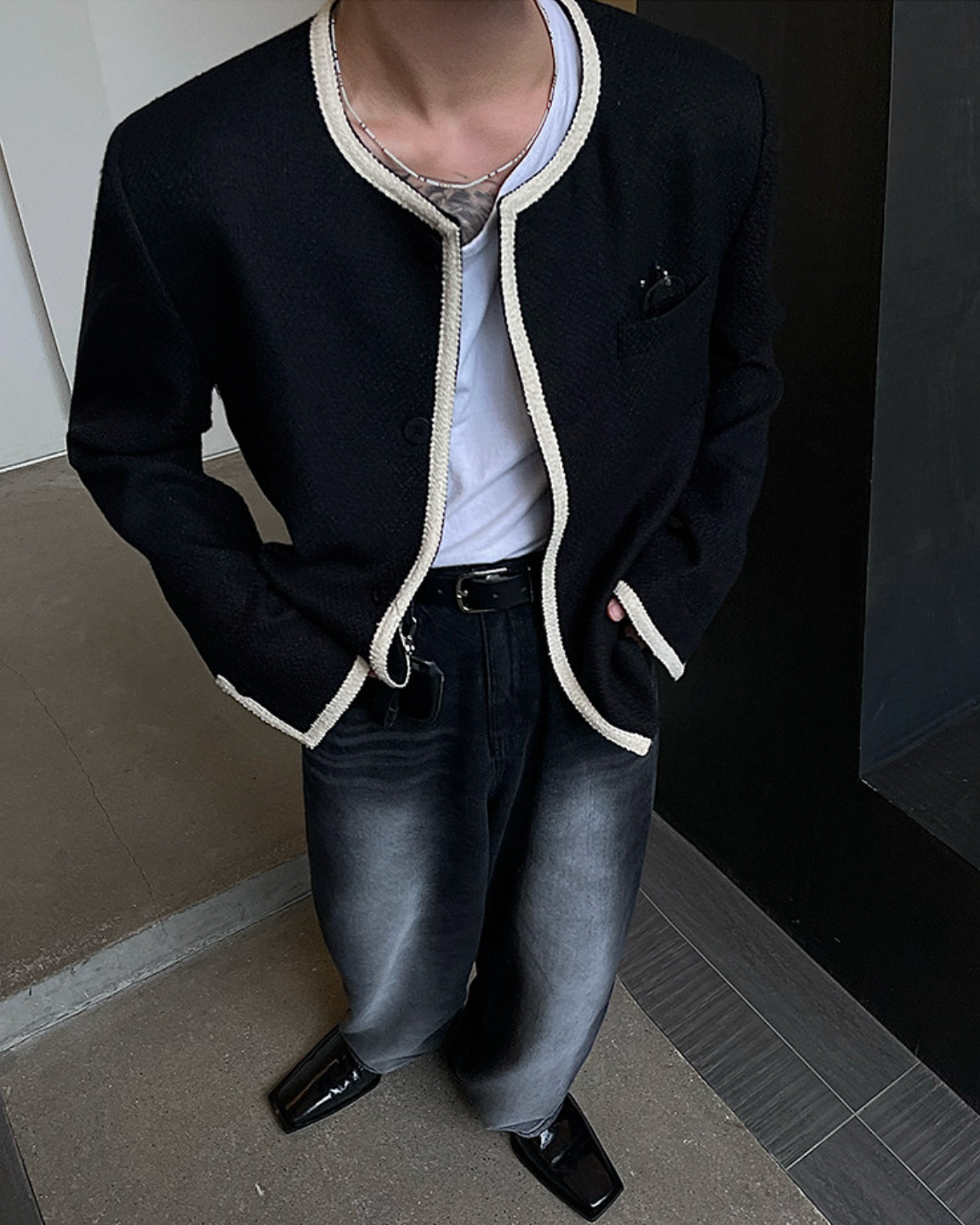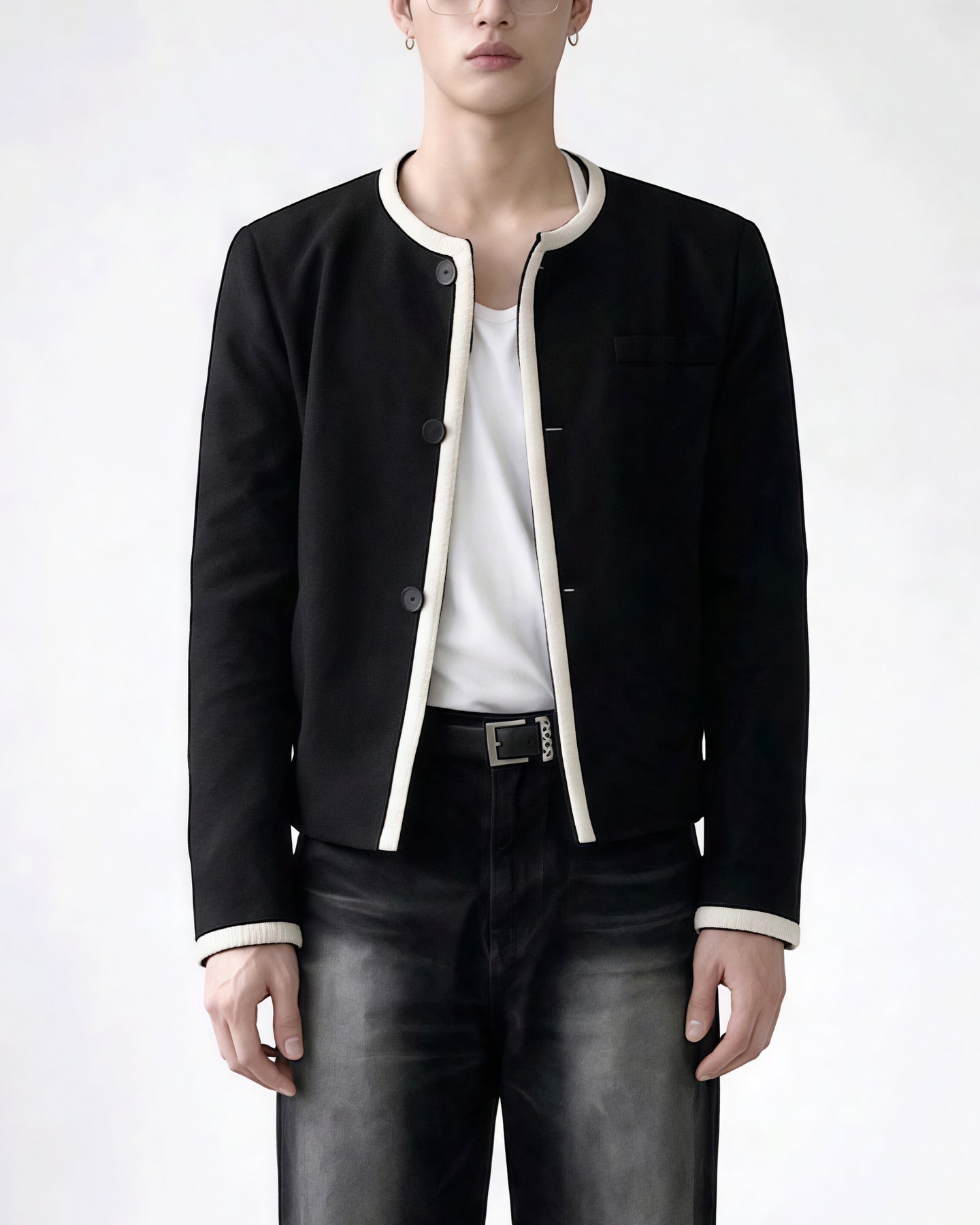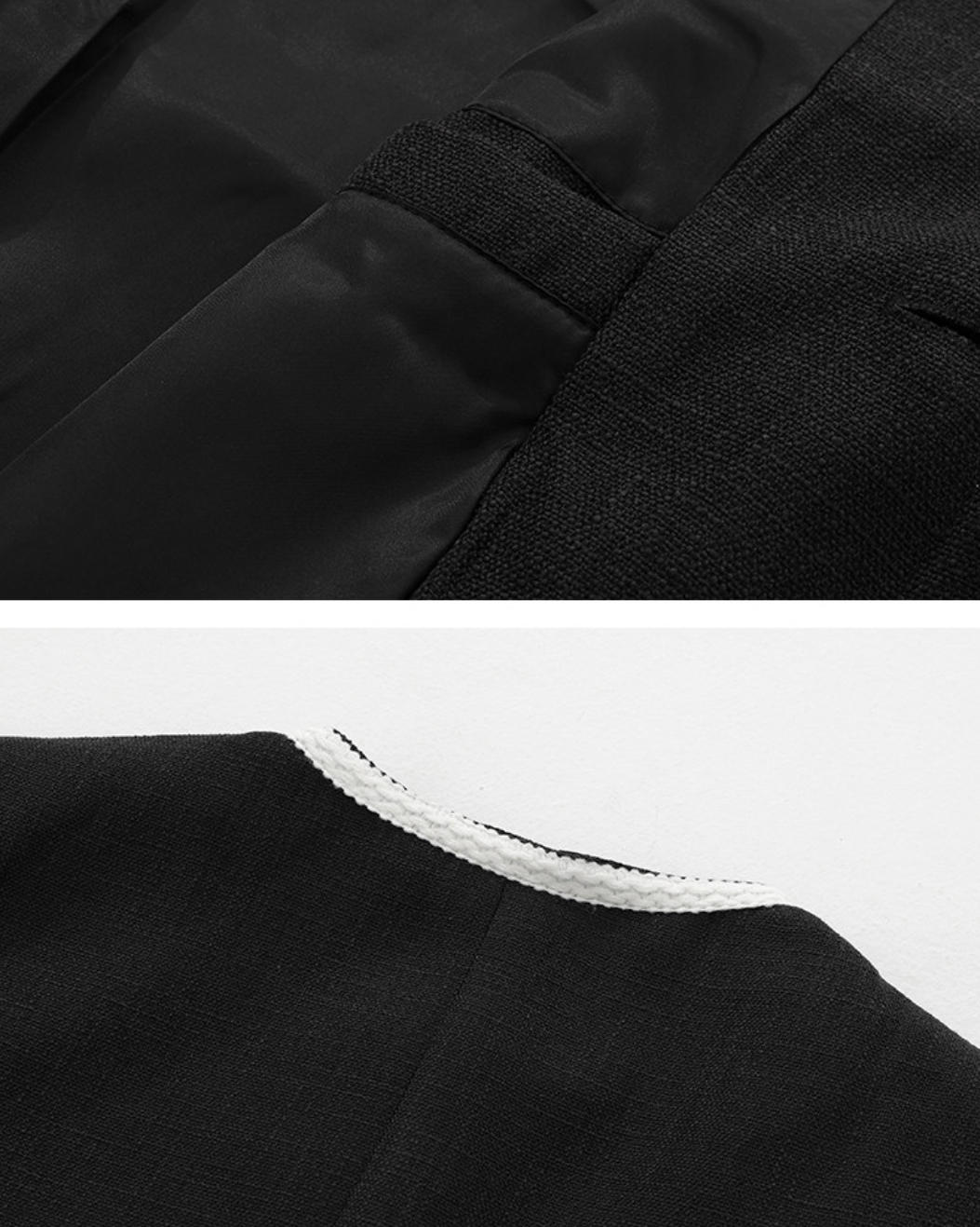首元をすっきり見せるノーカラーに、